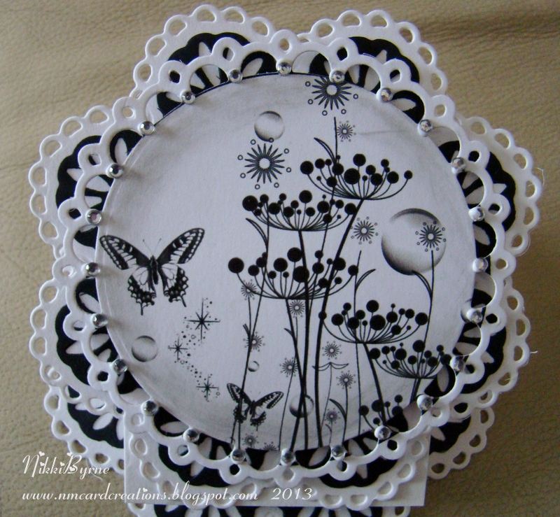 This beautiful image is from bugaboo stamps , the image is called dandelionsbflies and I have used a black chalk to distress it and the rest of the white card. I have also used clear mini gems around the edge of the top circle